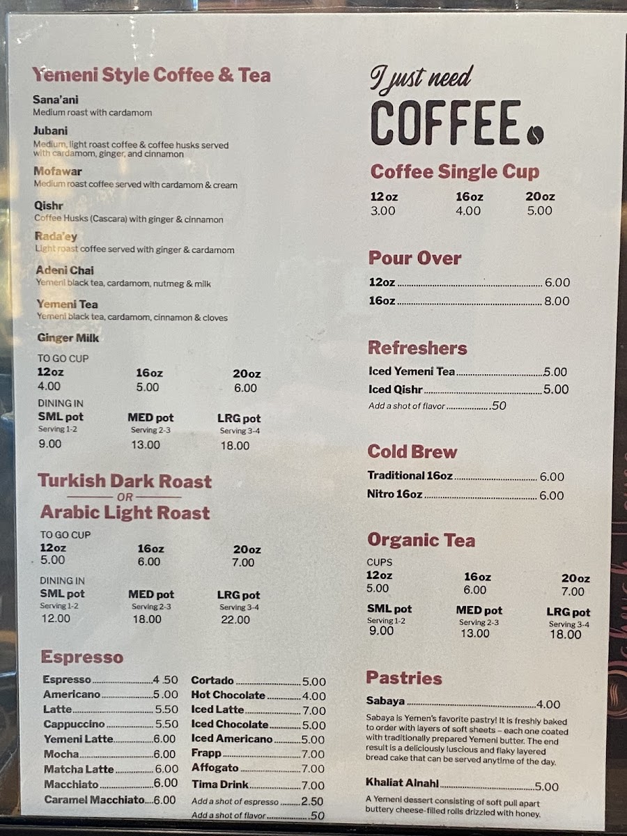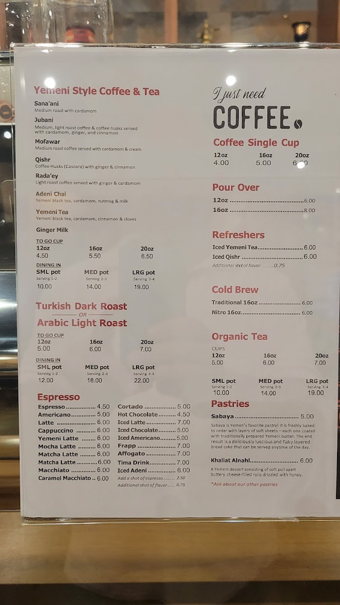 - Matcha and Refreshers: Including iced matcha, mango iced matcha, and flavored coffee husk (Qishr) drinks.
