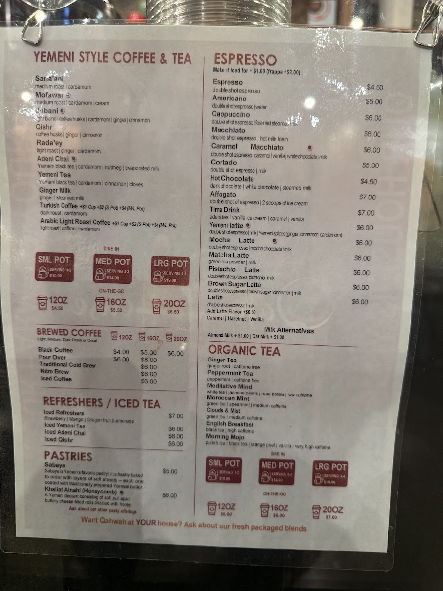 The menu at Qahwah House - Lombard features a variety of beverages and food items centered around coffee and traditional teas, suitable for breakfast, coffee breaks, or light meals. Visitors can explore a selection of hot and iced drinks, including espresso-based coffees, Turkish coffee, several matcha and refresher options, and specialty teas such as Adeni Chai and Adeni Tea.